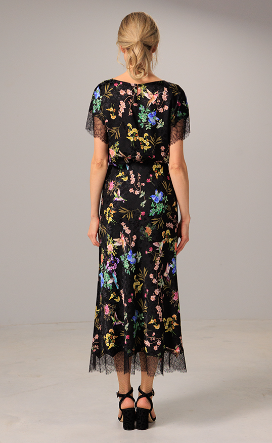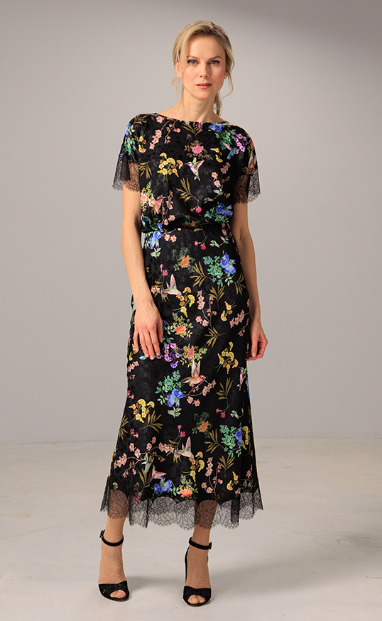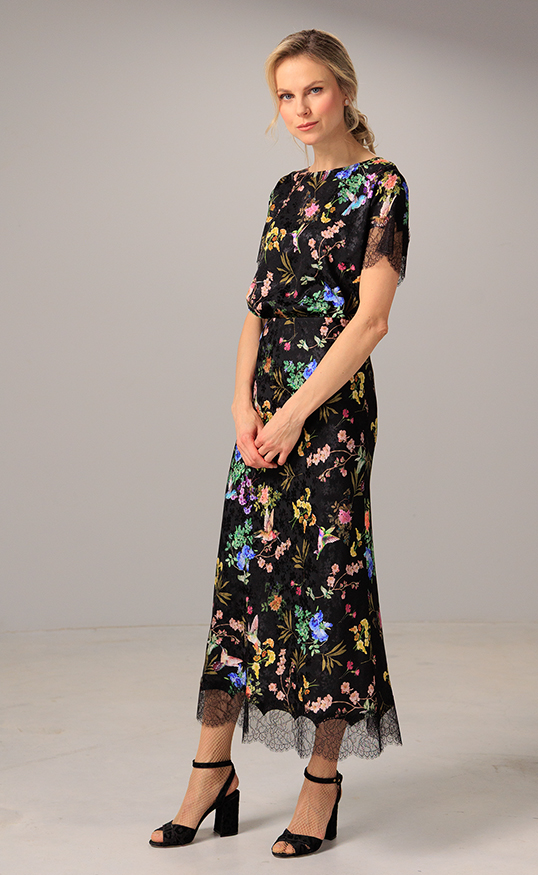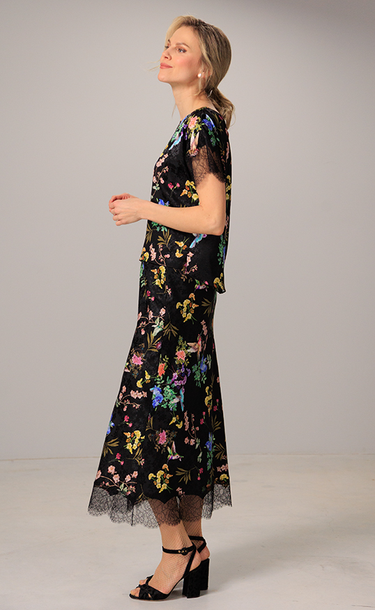 Floral silk jacquard meets soft laceāthis skirt blends timeless femininity with modern sophistication, complete with a matching top for a coordinated, effortless look.