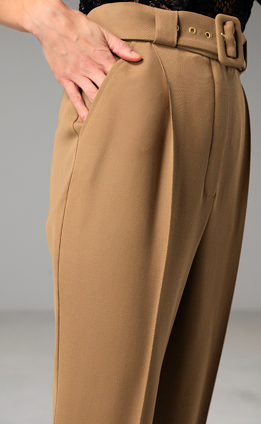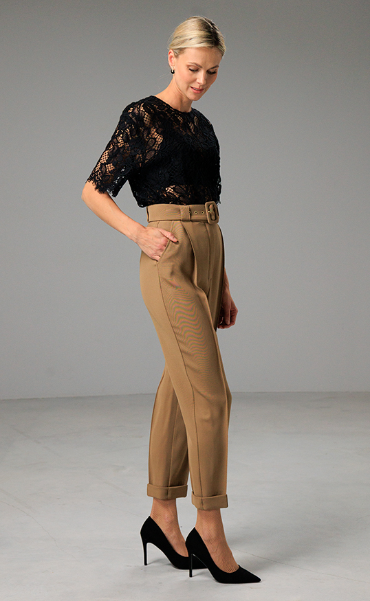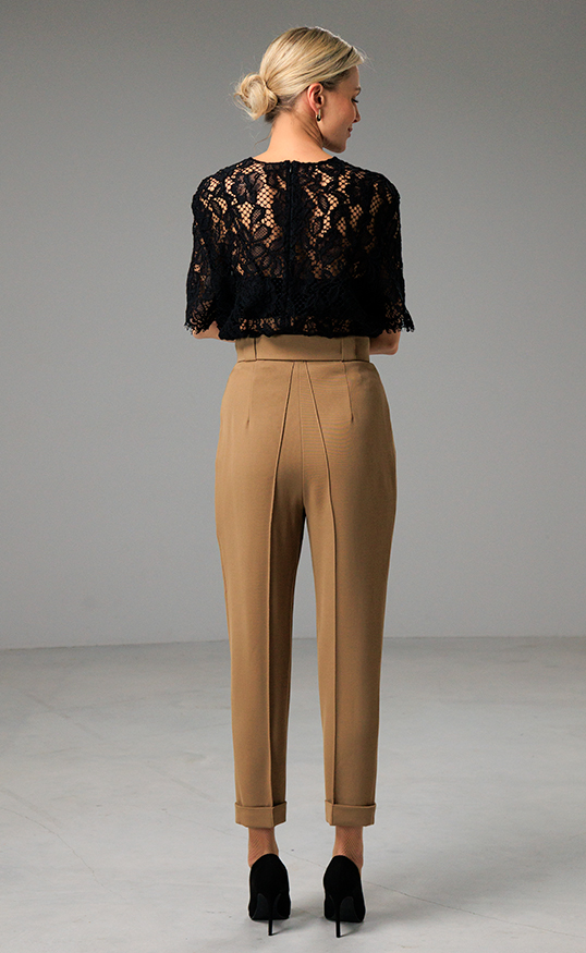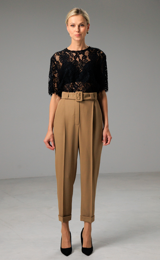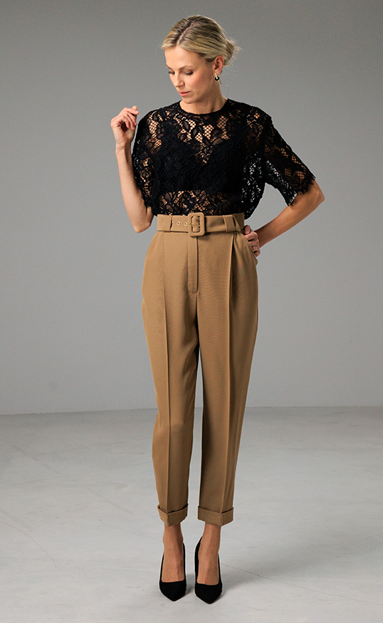The pants are an elegant and modern design. Crafted in black wool, the regular fit is distinguished by a high waist featuring darts and a belt.